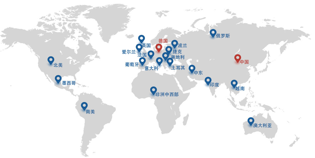 總部德國,全球子公司及辦事處:英國、愛爾蘭、法國、澳大利亞、中東、新加坡、俄羅斯、印度、奧地利、非洲中西部、意 大利、墨西哥、荷蘭、北美、南美、波蘭、捷克、葡萄牙、土耳其、越南、中國等34個國家級地區