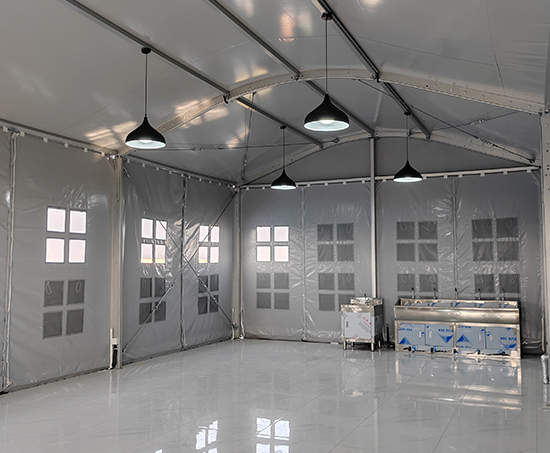 寬度5.8米,長度20米的工廠餐飲篷房。考慮到一側(cè)邊墻臨靠廠內(nèi)圍欄及廠外道路,給的方案就是這個邊墻做的是鋁合金框+ABS板,另外三個面做玻璃墻,一個邊墻配了兩個雙開門及雨拱。考慮到夏天吃飯比較熱,屋頂配了雙層篷布,用來隔熱。