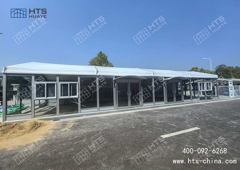 緊接著,華燁建筑科技的王經理去看了現場,客戶劃分的場地不是很大,可以做成寬度5.8米,長度20米的工廠餐飲篷房??紤]到一側邊墻臨靠廠內圍欄及廠外道路,給的方案就是這個邊墻做的是鋁合金框+ABS板,另外三個面做玻璃墻,一個邊墻配了兩個雙開門及雨拱??紤]到夏天吃飯比較熱,屋頂配了雙層篷布,用來隔熱。